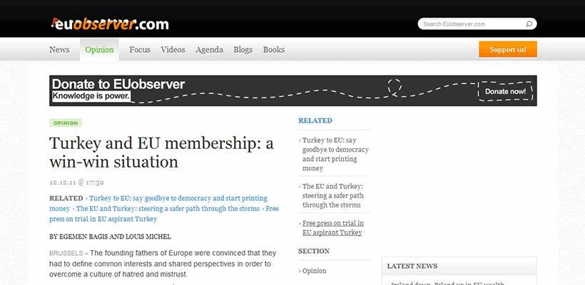 Article themed "Turkey and EU membership: a win-win situation" which was written by Minister for EU Affairs and Chief Negotiator Egemen Bağış and Member of European Parliament Louis Michel is published in EUobserver.