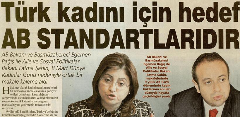 Avrupa Birliği Bakanı ve Başmüzakereci Egemen Bağış ile Aile ve Sosyal Politikalar Bakanı Fatma Şahin, 8 Mart Dünya Kadınlar Günü nedeniyle ortak bir makale kaleme aldı.